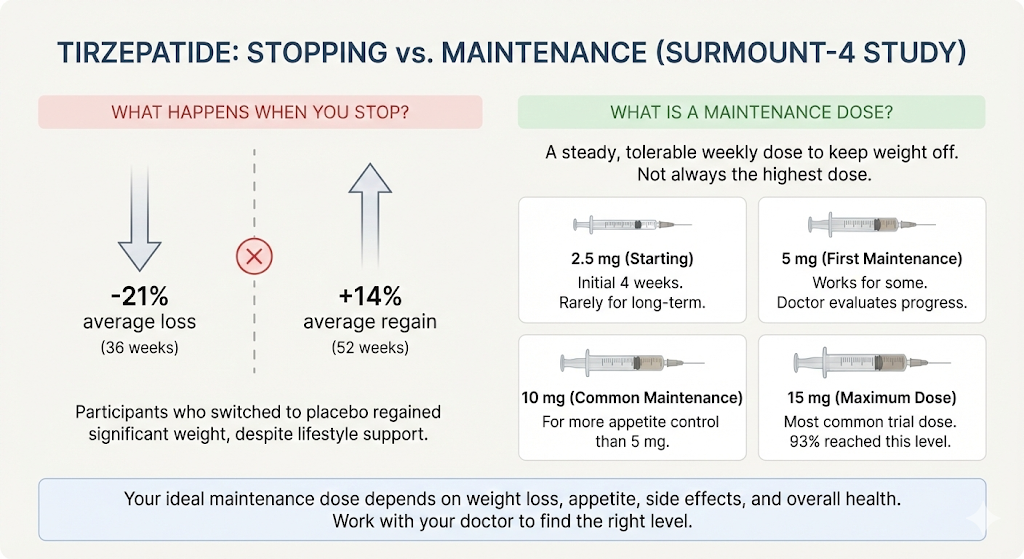 The recommended maintenance dose of tirzepatide for weight management is 5 mg, 10 mg, or 15 mg once a week, depending on how your body responds to medication and how well you tolerate it. After you have reached your weight loss goal, the research strongly suggests that staying on medication at an effective dose is key to keeping weight off. Stopping tirzepatide after losing weight almost always leads to significant regain.